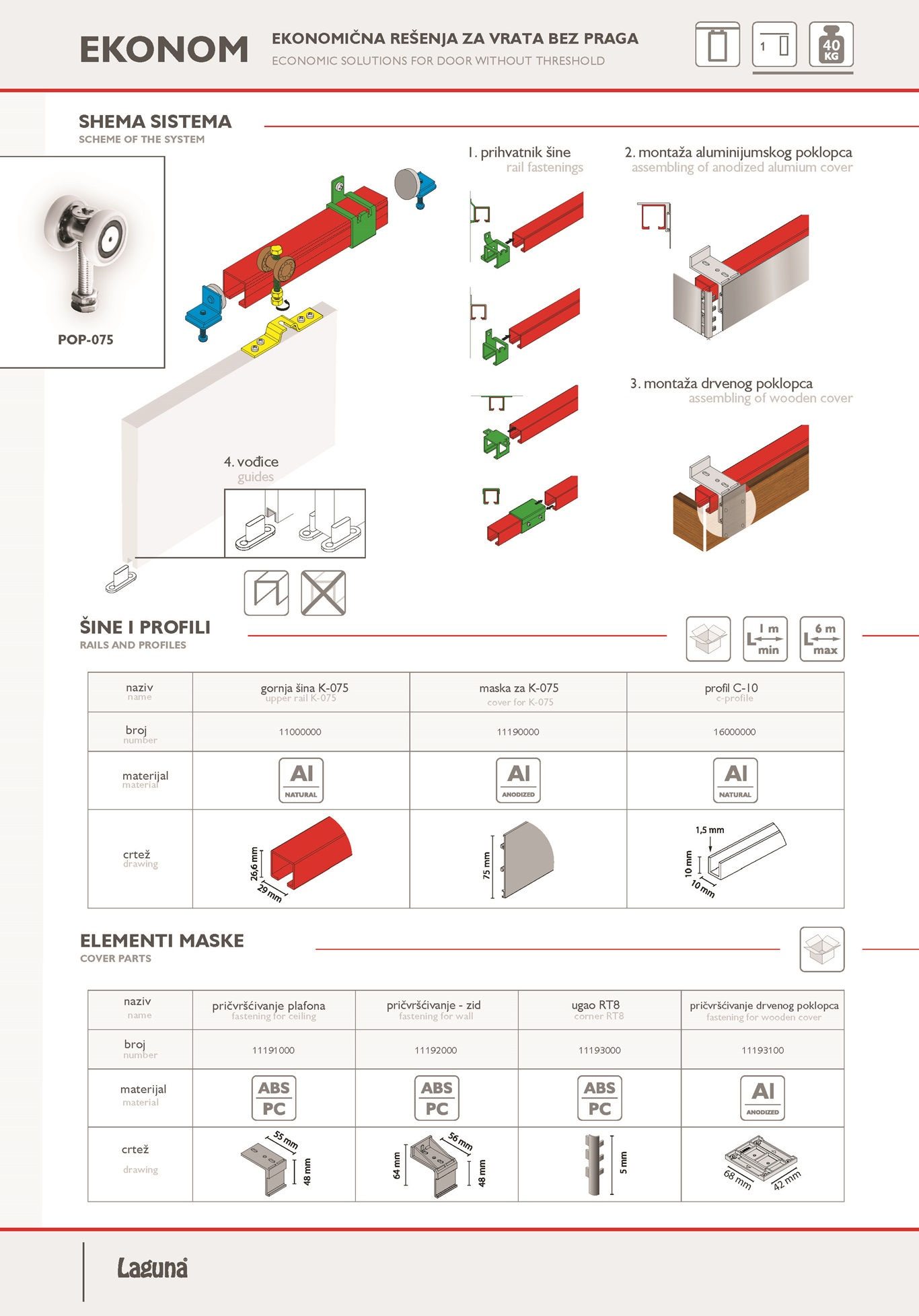 Dizajniran je za ploče debljine 8mm-18mm ili stakla debiljine 4mm-6mm i gornju šinu laguna K-075. Maksimalna nosivost sistema iznosi 50kg po krilu.